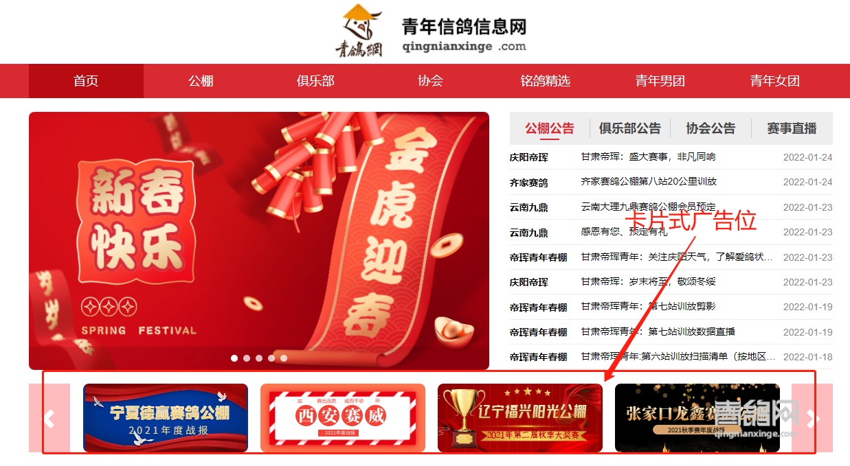 位置:位于青鸽网首页卡片轮播图 具体第几通栏根据广告排期